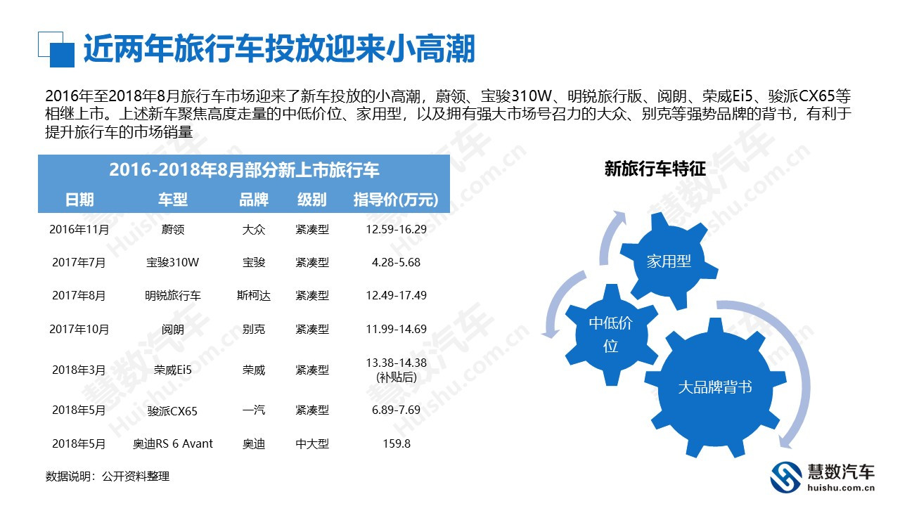 2016年至2018年8月旅行车市场迎来了新车投放的小高潮,蔚领、宝骏310W、明锐旅行版、阅朗、荣威Ei5、骏派CX65等相继上市。上述新车聚焦高度走量的中低价位、家用型,以及拥有强大市场号召力的大众、别克等强势品牌的背书,有利于提升旅行车的市场销量。