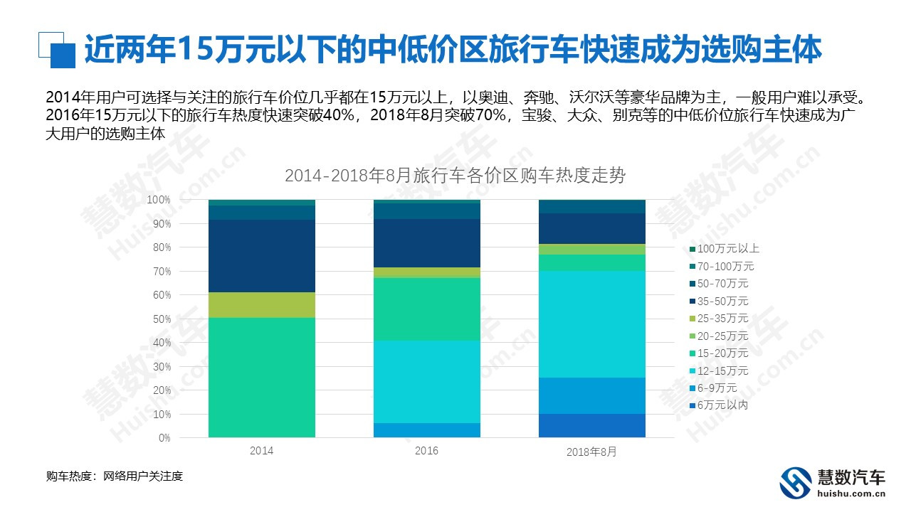 2014年用户可选择与关注的旅行车价位几乎都在15万元以上,以奥迪、奔驰、沃尔沃等豪华品牌为主,一般用户难以承受。2016年15万元以下的旅行车热度快速突破40%,2018年8月突破70%,宝骏、大众、别克等的中低价位旅行车快速成为广大用户的选购主体。
