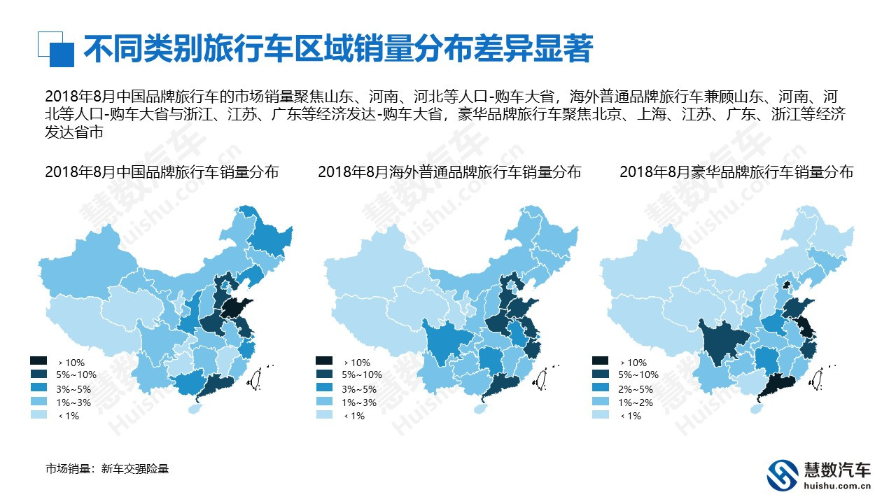 2018年8月中国品牌旅行车的市场销量聚焦山东、河南、河北等人口-购车大省,海外普通品牌旅行车兼顾山东、河南、河北等人口-购车大省与浙江、江苏、广东等经济发达-购车大省,豪华品牌旅行车聚焦北京、上海、江苏、广东、浙江等经济发达省市。