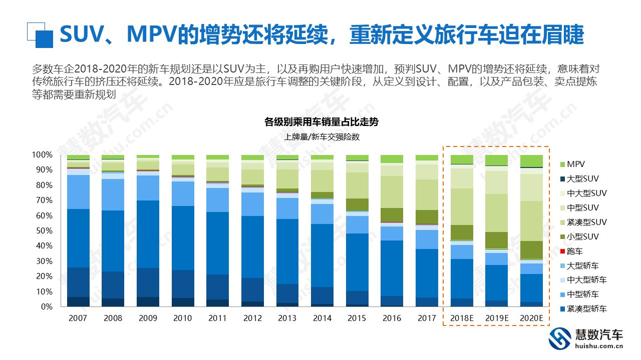 多数车企2018-2020年的新车规划还是以SUV为主,以及再购用户快速增加,预判SUV、MPV的增势还将延续,意味着对传统旅行车的挤压还将延续。2018-2020年应是旅行车调整的关键阶段,从定义到设计、配置,以及产品包装、卖点提炼等都需要重新规划。