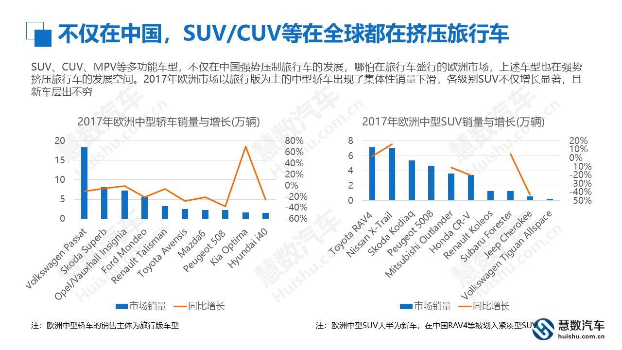 SUV、CUV、MPV等多功能车型,不仅在中国强势压制旅行车的发展,哪怕在旅行车盛行的欧洲市场,上述车型也在强势挤压旅行车的发展空间。2017年欧洲市场以旅行版为主的中型轿车出现了集体性销量下滑,各级别SUV不仅增长显著,且新车层出不穷。