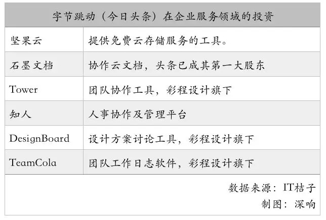比如字节跳动(今日头条,后文简称头条)。企业服务竟然是其头条投资第二多的领域(第一领域为文化娱乐)。人们熟知的一些明星项目,例如坚果云、石墨文档、Tower等,头条都有所投资。