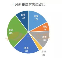 从十月新番类型上看,十月番剧和七月类型相似,大致为日常、恋爱、科幻、搞笑、推理、热血、奇幻等6大类。其中,主要以男性向的奇幻、热血题材为主,共占比49%,但女性向的题材,恋爱、日常类占比逐渐增大,10月份共占比27%。