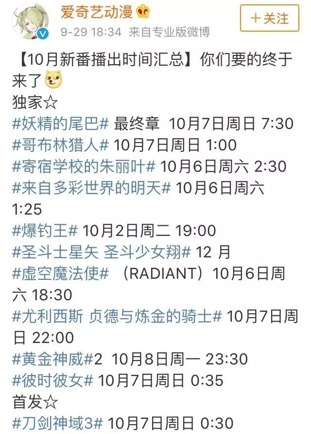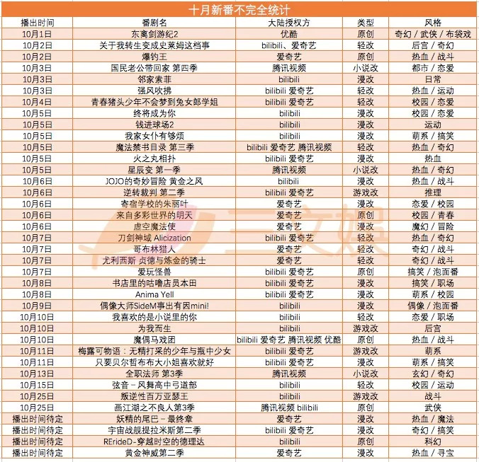 目前,已播出24部,原定于10月7日播出的《妖精的尾巴 最终章》播出时间暂定。“经典+潜力新作”的搭配,让这个十月备受期待。