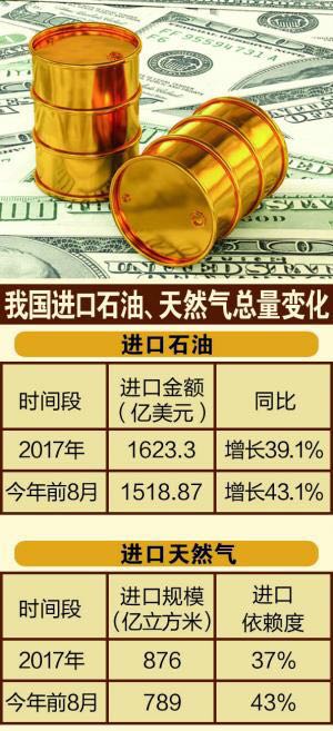 到了2018年,今年1~8月中国原油进口量为3亿吨,同比增长6.5%;进口金额已达1518.87亿美元,同比增长43.1%。今年1~8月中国天然气进口量为5718万吨,同比增长34.8%;进口金额为228.65亿美元,同比增长64.7%。