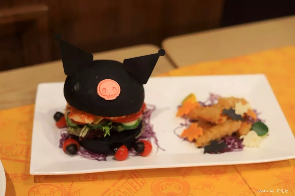 顶着一双大耳朵和招牌骷髅的库洛米造型竹炭汉堡,搞怪又可爱。汉堡里藏有肉感丰厚的鲜味加拿大环保龙虾,搭配生菜、蕃茄、黄瓜等鲜味蔬菜和浓郁的切达奶酪,搭配外酥内软的脆炸南瓜和新鲜圣女果,邀请游客一起施展魔法力量。
