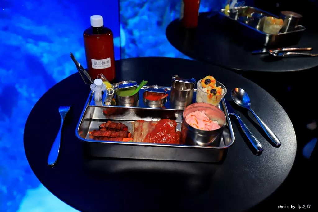 继续着海洋公园的美食之旅,在海龙王餐厅可以看魔鬼鱼和鲨鱼共舞,同时品尝恐怖的急诊室哈喽胃套餐,灵魂之窗,曲张静脉,吓破胆,冷血浆,天残手,新鲜脑浆,纱布与崩纱,恶魔之泪,各种食物仿佛是医院里的手术台,很是恐怖。