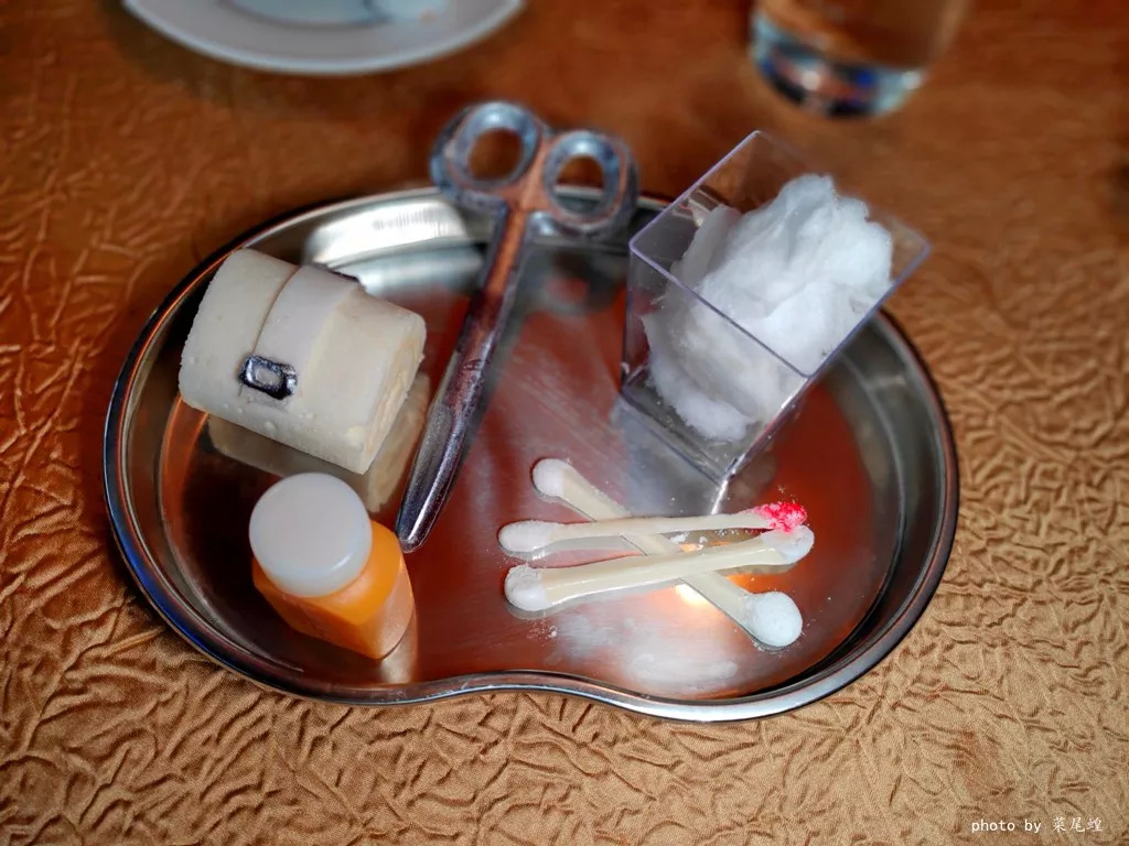 纱布与绷带(蛋白瑞士卷配绵花糖、芒果酱及朱古力)配 H agen-Dazs 迷你雪糕杯做手术若想得心应手,必须配备齐全的医疗用具:将棉花球般的棉花糖,蘸上消毒药水瓶内的芒果酱,甜而不腻;还有装扮成卷卷纱布的蛋白瑞士卷,口感独特;加上浓郁滑溜的白巧克力棉花棒和黑巧克力剪刀,定能满足各位食客。