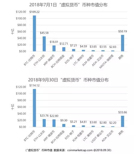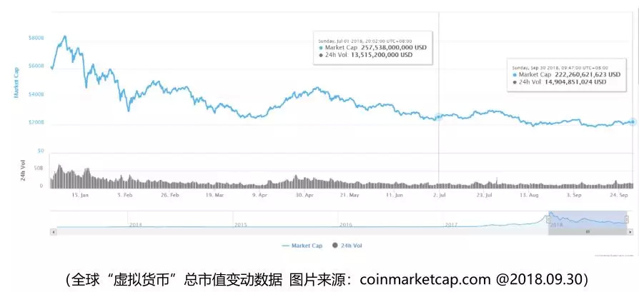 2018年7月1日至2018年9月30日三个月期间,全球“虚拟货币”的总市值持续5月以来的低迷,总体依然呈现下跌趋势。