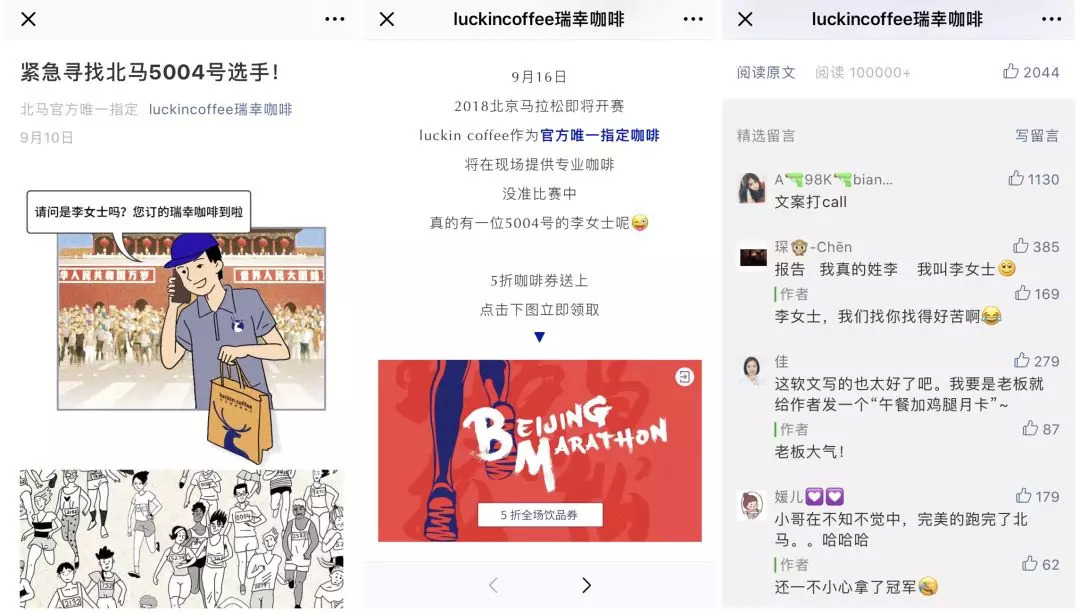 瑞幸咖啡曾推过一篇软文,名字叫“紧急寻找北马5004号选手”,讲的是在北京马拉松期间,一个5004号选手点了一杯咖啡,瑞幸的快递员在寻找这位选手的过程中跑完北马全程的故事,最后引出瑞幸咖啡的赠券。