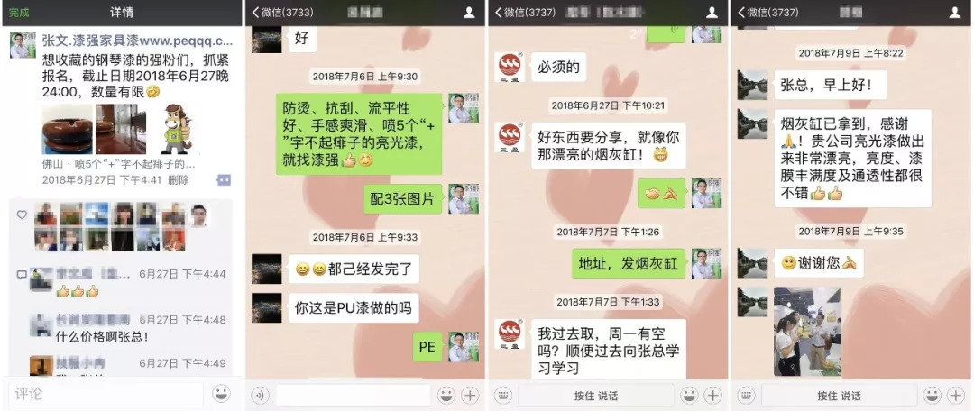 漆强在加了客户的微信后,没有被动地等客户自己找上门,而是把朋友圈当作了自己产品的秀场,经常分享一些有趣的视频,例如用开水烫用了自己的亮光漆的烟灰盅,再搞活动送客户同样印有漆强logo的钢笔等等,持续的吸引客户的关注。