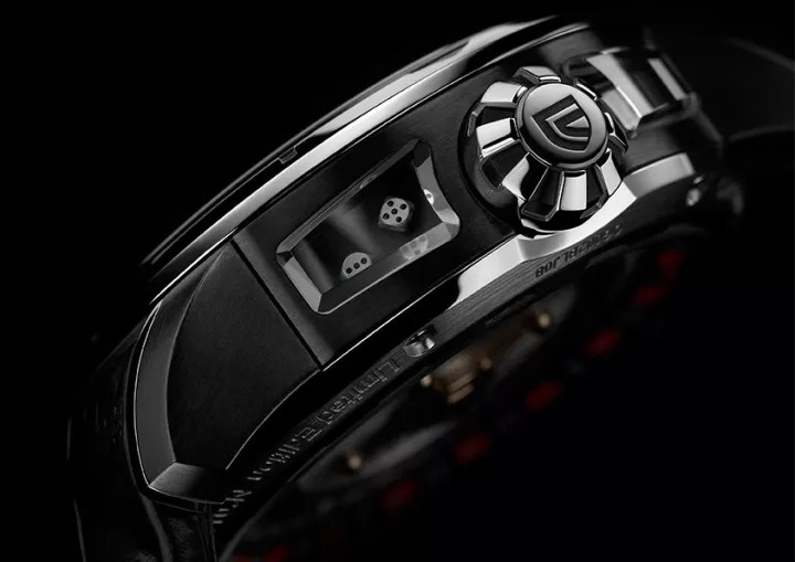 和其他两款手表一样,Blackjack拥有72小时动力储存,30米防水,钛金属的表壳和表冠,搭配黑色鳄鱼皮表带。