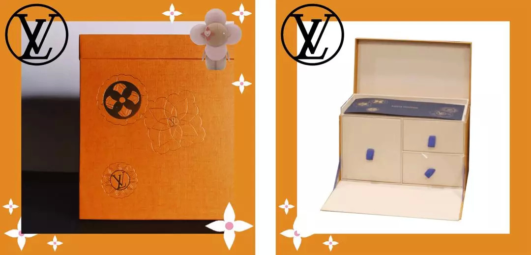 今年的盒子还是小抽屉式的,除了Logo,还多了些金色的印花,是LV今年用在箱包上的旅行贴纸元素,四舍五入就是一个最新款LV包包啊~