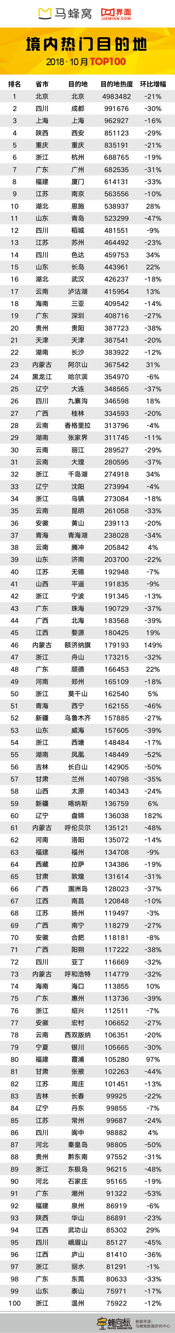 近日,马蜂窝旅游网联合界面推出2018年10月“旅游蜂向标”,基于马蜂窝旅游大数据平台,通过分析境内外100个目的地的热度变化,对10月旅游趋势进行了预测。