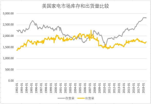 持续多年的美国经济复苏,推动了家电行业的增长,同时也将美国家电的库存推升至历史高位。但是从上图可以明显看到,美国家电市场的出货量从2017年开始已经在下降。这意味着销售的放缓。