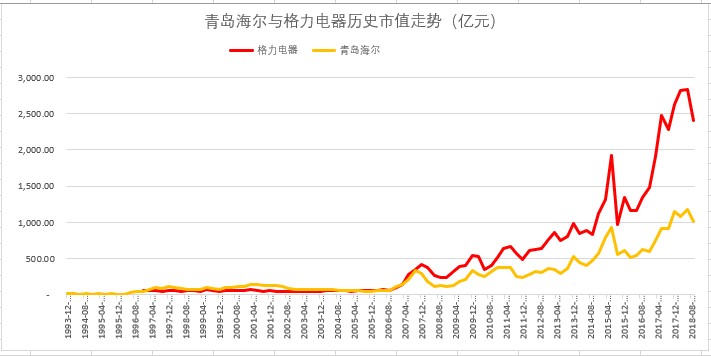 业绩表现最终体现在市值上:作为最早登陆中国资本市场的家电巨头,青岛海尔的总市值一度接近格力电器的两倍。但从2005年开始,双方市值差距逐步缩小,格力反超海尔。