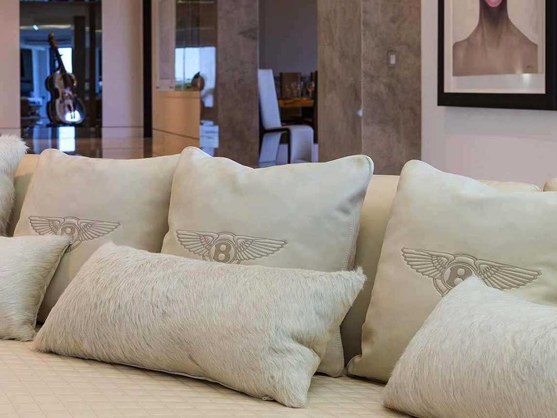 佩尔森在客厅中摆放着巨大的皮质沙发和椅子,均由宾利制造,沙发靠垫上还有宾利“B”字母商标的压花。