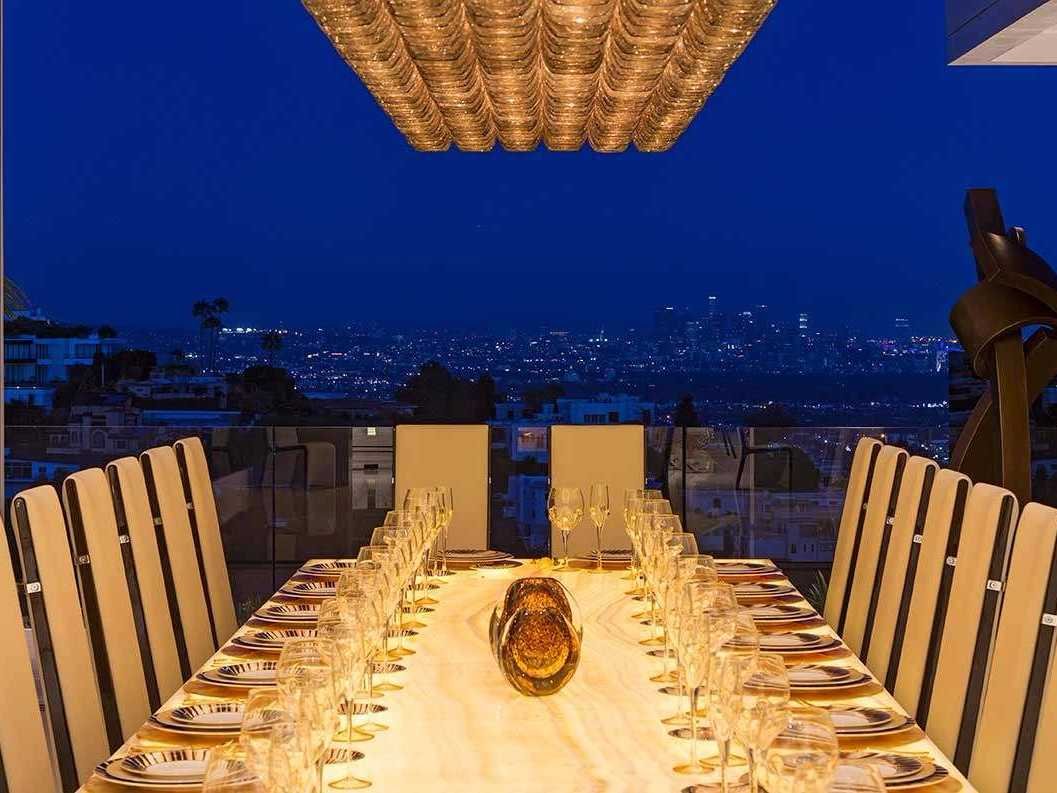 当佩尔森打算大宴宾朋的时候,餐厅中5.5米长的玛瑙餐桌可以坐下24人。每个座位以及餐具摆设都是由意大利时装设计师罗伯特•卡沃利(Robert Cavalli)操刀设计的。
