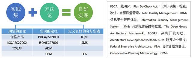 以目前常见的良好实践为例,例如,全面质量管理、信息安全管理体系和联邦企业架构等,都可以按照上述两个要素去考虑,对应关系如图1所示。