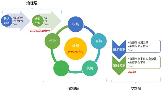 管理层主要关注业务过程层面的问题。在CPA模型中,数据全生命周期管理就在这个层面中,在管理层,将其统称为处理(processing),该词汇主要来源于《欧盟通用数据保护法规》(General Data Protection Regulation,GDPR)。处理是GDPR中的一个重要的概念,覆盖了针对个人数据的各类操作,例如,收集、记录、组织、建构、存储、适应或修改、检索、咨询、使用、披露、传播或以其他方式应用,排列或组合、限制、抹除或销毁等。用于数据处理的技术是中性的,可以是手工的,也可以是自动的。