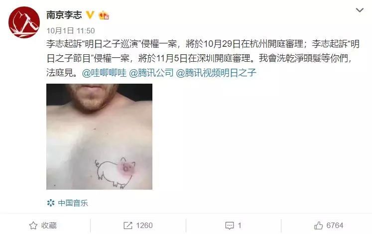 2011年至今,李志因著作权问题“撕”过虾米、酷我等音乐平台,向农夫山泉讨要过说法;去年,《吐槽大会》曾擅自使用过李志的歌曲,节目制作人李诞为此公开进行道歉。今年1月和7月,李志公开向《明日之子》维权,并最终将《明日之子》告上了法庭。