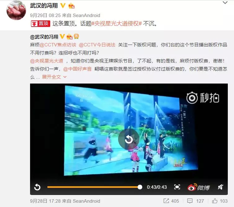 民谣音乐人冯翔这个国庆节过得有点糟心。一连七天,他都在微博上为自己的音乐《窗》被《星光大道》侵权一事发声。“凡侵权者,窃贼也。”他愤怒地在微博写到。但他的愤怒并没有被重视,冯翔告诉毒眸:“至今没有任何一个侵权方联系过我,接下来,我还是会争取通过法律程序解决。”