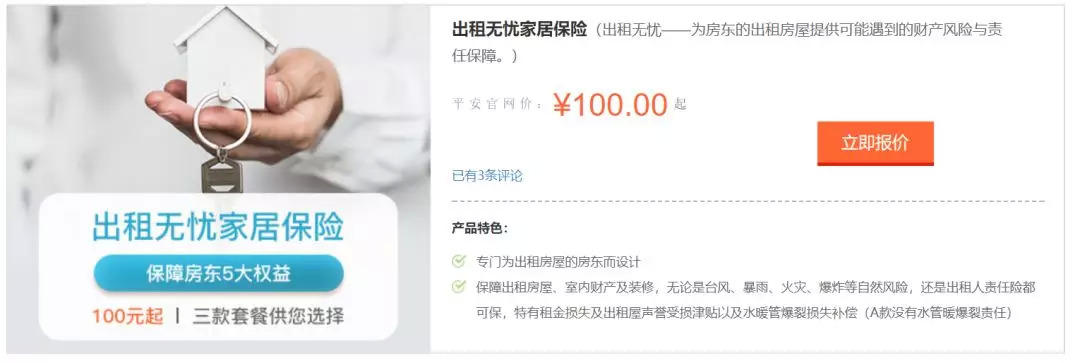 在国内,一些险企也推出了房屋出租保险,专为出租房屋的房东设计,一方面为房屋的出租方提供财产、租金损失保障及房屋出租人责任保障,另一方面也为房屋的承租人提供室内财产、搬家损失保障和意外伤害保障。如平安保险推出的“出租无忧家居保险”产品,根据保障范围不同,保费分为100元,200元和至500元三档,保障期限为1年,主险最高赔偿额度为30万、100万和300万。