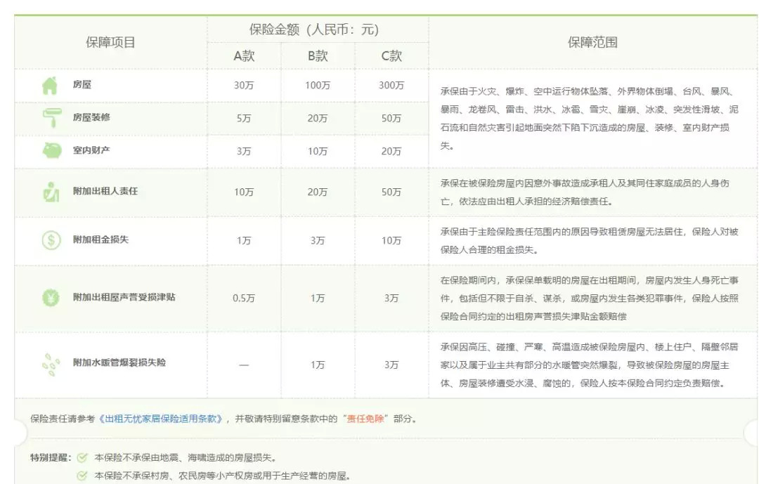 个人财产保障用于赔付火灾、爆炸、盗窃等原因造成的租客个人财产损失。责任保障则用于赔付由于房屋事故等原因造成的他人财产损失或人身伤害。当租客由于房屋发生事故导致无法居住,部分房租租赁保险还会赔付租客搬家及额外租房的费用。