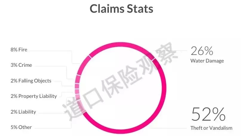 Lemonade公开数据显示,52%的理赔为个人物品的盗抢理赔,26%为水灾理赔,其他的理赔内容包括火灾、犯罪等。