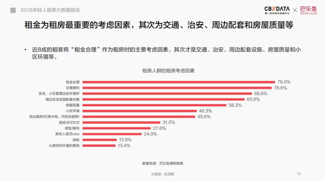 《报告》指出,在人口流动、居住观念和政策利好等多重因素的促进下,住房租赁市场将持续增长,90后95后年轻人成为租房主力军;租金是年轻人租房首要考虑因素,其次为交通、治安、周边配套和房屋质量等;合租成为年轻人租房的趋势,90后和95后租客中超过80%选择合租;从家电、到家居、再到摆设装饰、厨房厨具,年轻人的租房生活讲究样样精致。