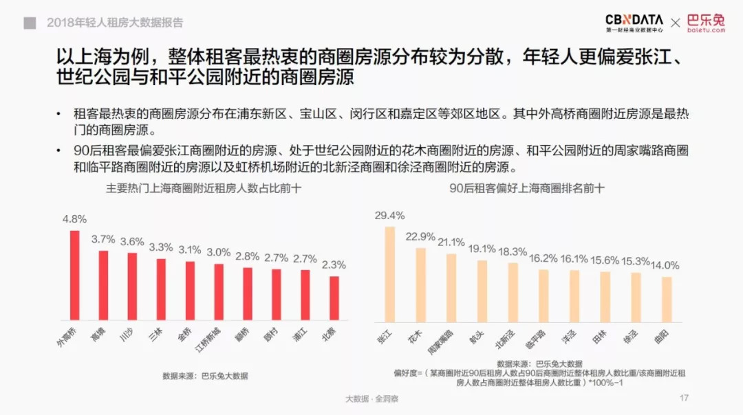 以上海为例,由于商圈和交通枢纽相对分散,整体来看,相对偏远的外高桥、高境、川沙等商圈是价格洼地,也最热门,但对于通勤要求更高的年轻人来说,更靠近市中心、又有价格优势的张江、世纪公园与和平公园附近的商圈房源显然更受他们的欢迎。