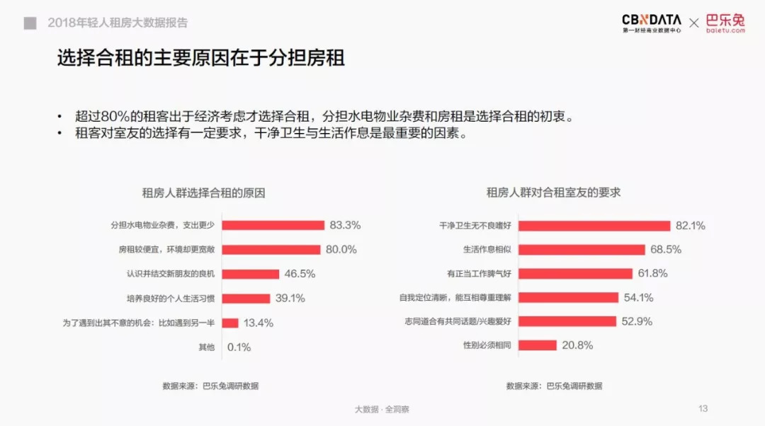 为了能“鱼和熊掌兼得”——租金便宜又交通便利,“合租”成为一种最好的选择。CBNData《报告》援引巴乐兔调研数据显示,合租已经成为年轻人租房的一种趋势,90后和95后租客中超过80%选择合租。主要原因就是对经济因素的考量,分担水电物业杂费和房租是他们选择合租的初衷。不过以独生子女为主的90后95后租客对室友的选择有一定要求,干净卫生与生活作息是他们最看重的因素。