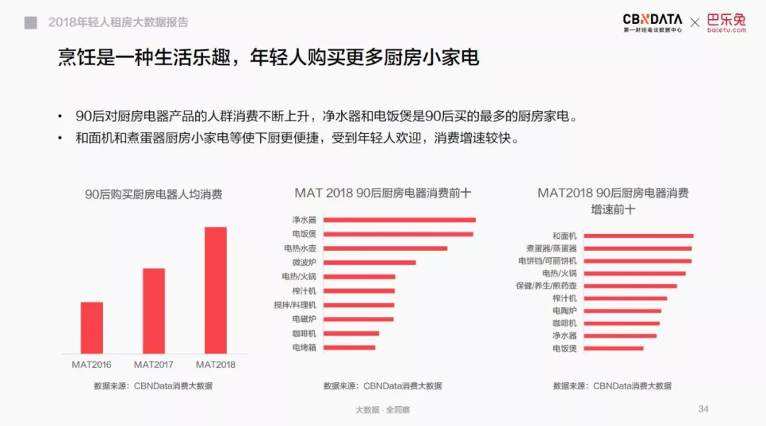 虽然外卖催生的“懒系”吃饭法主导了多数人的饮食生活,但越来越多的90后开始用起了出租屋里的厨房。CBNData消费大数据显示,他们对厨房电器产品的消费不断上升,净水器和电饭煲是90后买的最多的厨房家电。和面机和煮蛋器等更便捷的厨房小家电,也受到年轻人欢迎,消费增速较快。