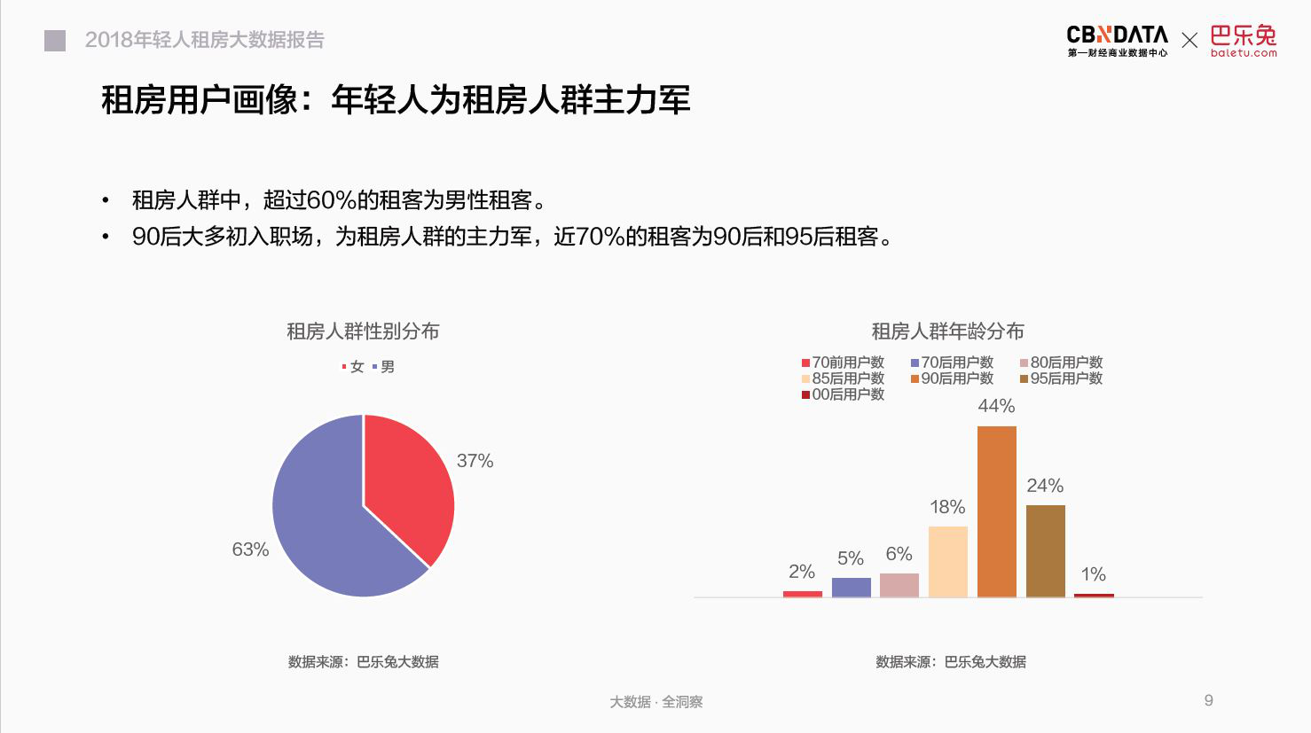 当“稳定”不再是这届90后、95后新生代的唯一追求,当各地政府大力推动“租售同权”等租房利好新政,在多重因素的共同促进下,CBNData《报告》预计住房租赁市场未来将持续增长。与此同时,以巴乐兔为代表的住房直租平台正在租房市场中慢慢崛起,这种模式免去了高昂的中介费用、信息更透明、成交周期更短、效率更高、租客体验更好,受到年轻人的追捧。巴乐兔大数据显示,其中近70%的租客为90后和95后。