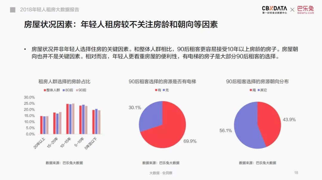 不过,他们也有自己的独特需求,那就是电梯。相对而言,CBNData《报告》指出,年轻人更看重房屋的便利性,有电梯的房子是大部分90后租客的选择。