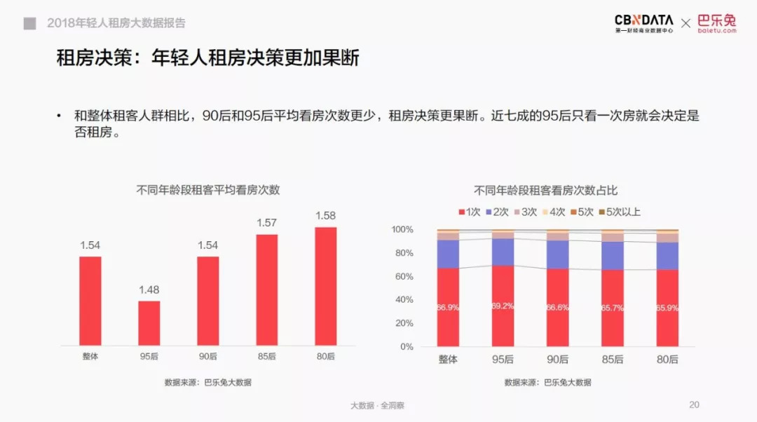 值得注意的是,和整体租客人群相比,这届年轻人租房做决策更果断。一方面,90后和95后平均看房次数更少,近七成的95后只看一次房就会决定是否租房。另一方面,和整体租客人群相比,90后和95后的签约也更加果断,九成的90后和95后会选择在看房后一天以内签约。95后平均只需要0.72天就会建立租约,而整体租客人群则平均需要0.95天。
