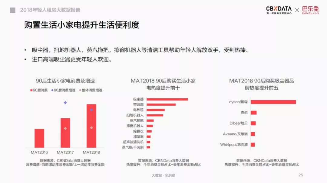 CBNData《报告》显示,90后购买小家电的消费额呈逐年递增趋势,消费增速明显高于整体消费增速,吸尘器、扫地机器人、蒸汽拖把、擦窗机器人等清洁工具帮助年轻人解放双手,受到热捧。进口高端吸尘器尤其受欢迎,近年来大火的戴森成为热度提升最高的吸尘器品牌。