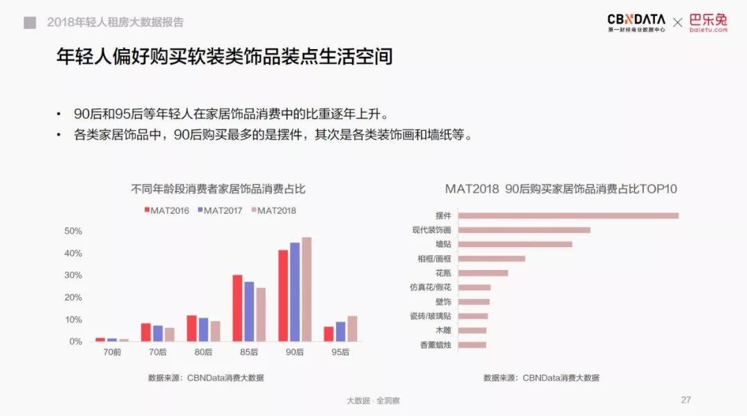 为了让出租屋更有家的感觉,家居饰品、绿植等都是能让温馨度大大提升的必需品。CBNData《报告》发现,90后和95后等年轻人在家居饰品消费中的比重逐年上升。各类家居饰品中,90后购买最多的是摆件,其次是各类装饰画和墙纸等。此外,90后也爱购买鲜花绿植类产品。