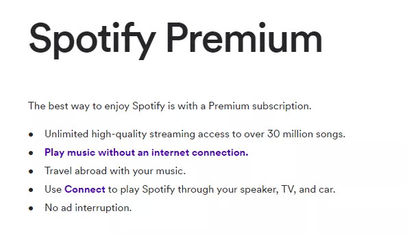 Spotify Premium是它主流的付费订阅服务,售价为每月9.99美元。用户可以按需播放任何类型的歌曲,搜索新音乐,搜索和收藏播放列表,分享音乐和播放列表,收听Spotify的广播功能选择的曲目,以及创建和编辑播放列表。用户还能享受到高码率(320 kbps)的音乐并且把自己喜欢的音乐下载缓存。当然,这个版本没有广告。