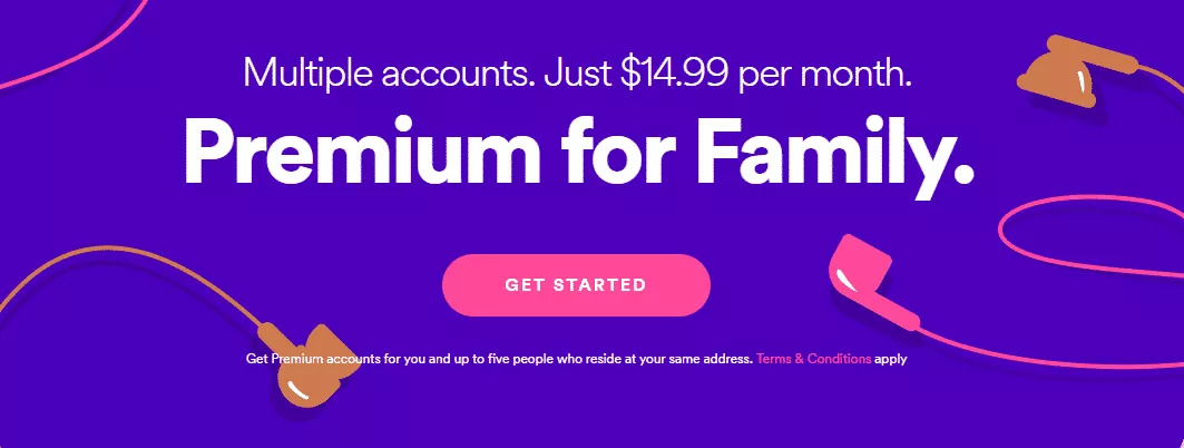 Spotify Family是Premium的家庭版本,售价为每月14.99美元,于2014年10月推出,最初它可以让5个家庭成员共享Premium订阅,2016年5月,分享成员限制提升到6个。尽管是共享版本,每个家庭成员却都有自己的账户,并且能够拥有个人化的音乐库,包括播放列表、专辑和单曲。