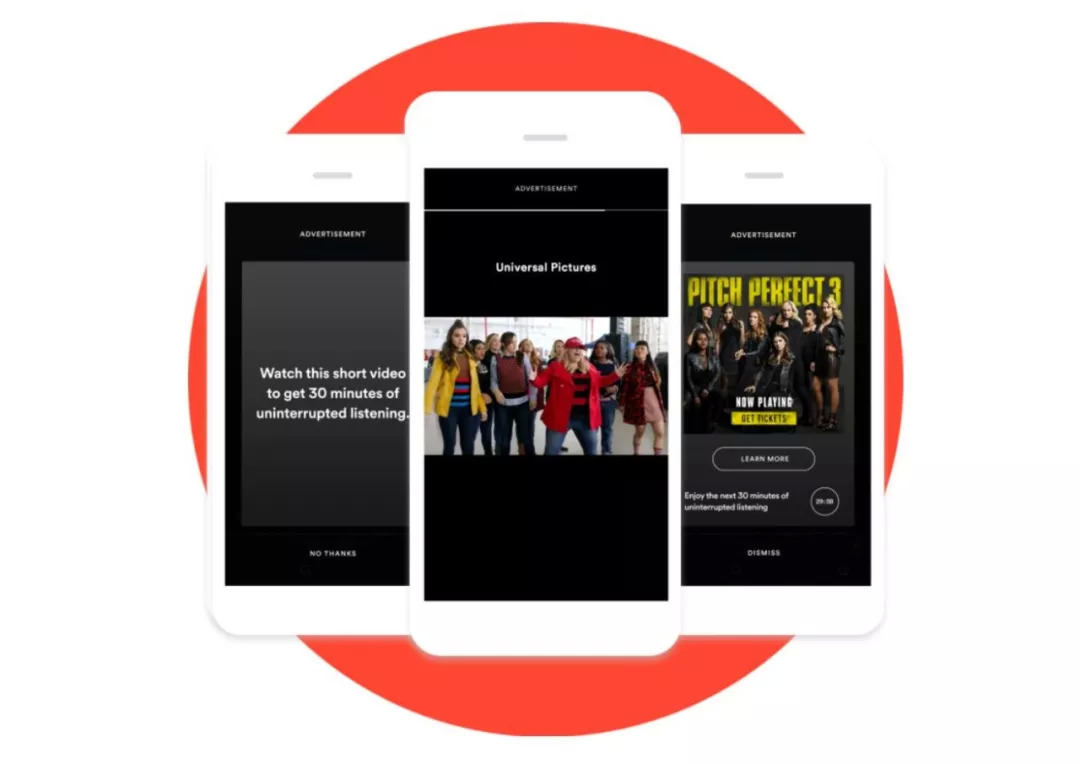 Spotify的视频广告分为两种,一种为“Sponsored Sessions”,它鼓励免费用户观看一段视频广告,之后他们能够享受30分钟的无广告播放时间(音频广告每隔15分钟播放一次)。