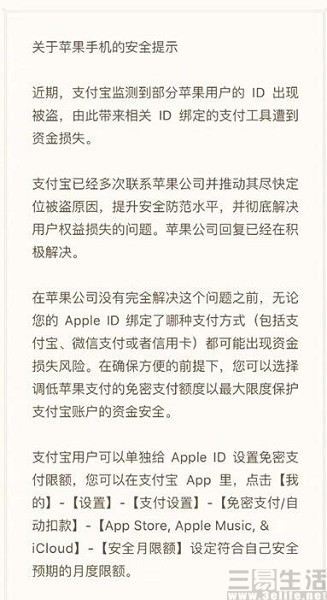 昨晚,支付宝官方微博发布了关于苹果手机的安全提示,并表示已经检测到部分苹果用户Apple ID被盗,由此带来绑定的支付工具遭遇资金损失。目前,苹果方面已回复表示正在积极解决,支付宝方面建议此类用户调低免密支付额度,以最大限度保护资金安全。