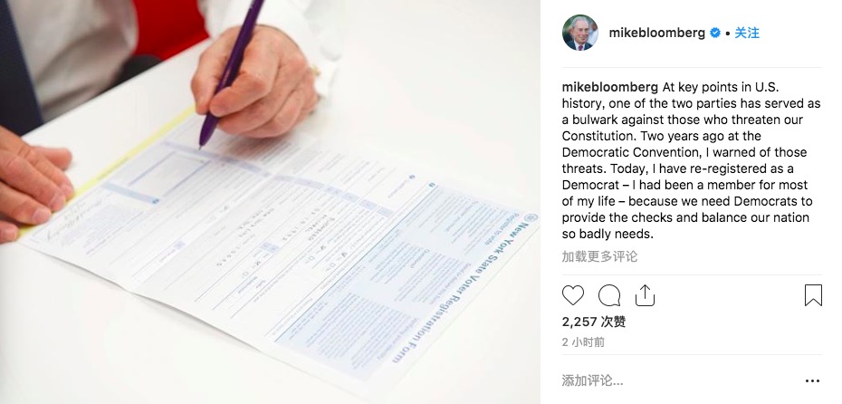 现年76岁的布隆伯格原本就是民主党人,但在2001年成为共和党人,又于2007年放弃党籍,随后一直作为无党派人士从事政治活动。本周三(10月10日)上午,布隆伯格在图片社交网站Instagram上宣布成为民主党人,同时提到了他在2016年民主党全美代表大会上的发言: