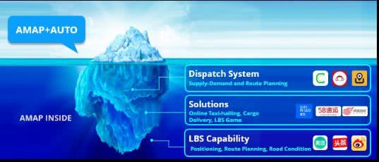 担任高德集团总裁的刘振飞在面向阿里全球投资者的一次会议里,将一张冰山壁纸投影到了背景板上,他将冰山结构比作当下的高德地图:用户能够直接使用的手机和汽车导航业务只是海面上的部分,而沉在水下的更为巨大的部分,则是高德地图向行业输出的技术能力,比如美团、头条、微博这些公司,用的都是高德的定位技术,高德还为菜鸟、滴滴输出基于货车和网约车的解决方案等等。