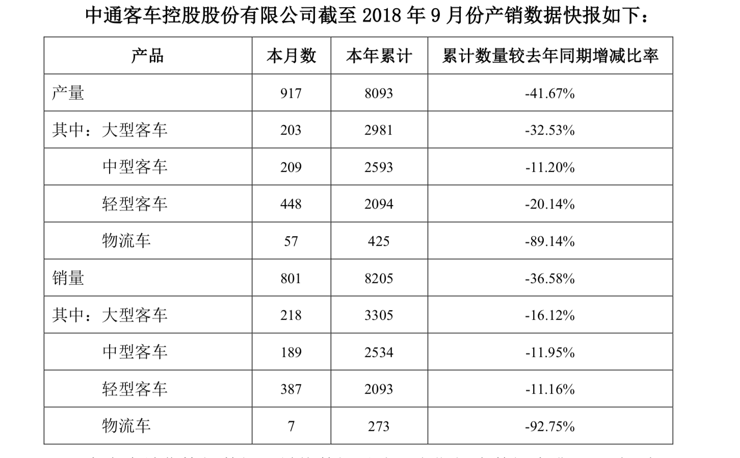据早前中通客车披露九月产销数据,其全品类产品产销量均大幅下滑,产量同比减少41.67%,销量同比下滑36.58%。值得注意的是,其物流车九月份的销量仅有七台。