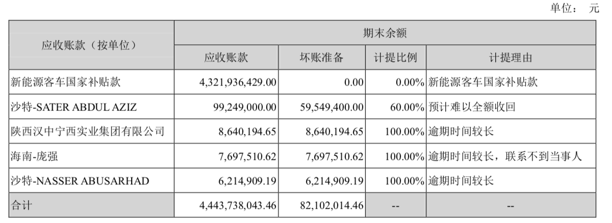 在其半年报应收账款内,占据中通客车营收账款大头的是新能源补贴款项,为43.22亿元,占据了97%的比例。