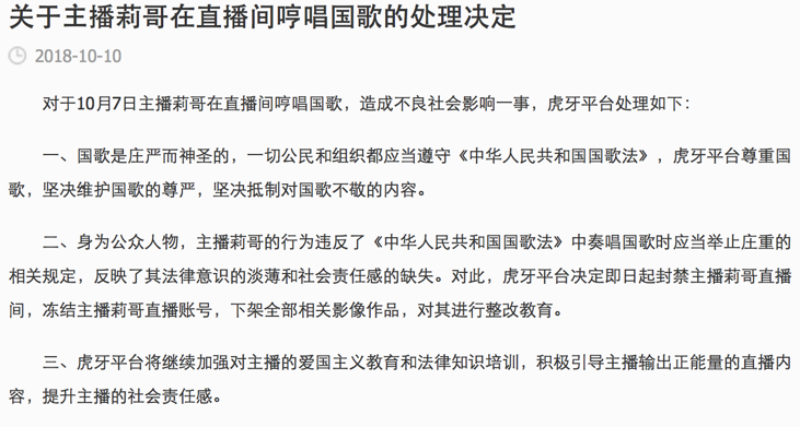10月10日,虎牙直播(HUYA)公告发布了一条对其刚签约不久的大V主播“莉哥”的处理决定,冻结其账户并进行整改教育。起因为“莉哥”直播歪曲演唱国歌,造成负面影响。此时,距虎牙赴美上市刚刚满5个月。