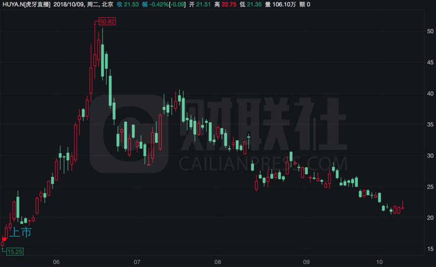 虎牙上市后股价一路飙升,一个月时间从15.25美元涨到50.82美元,市值最高超100亿美元。但随后就遭遇断崖式下跌,截至10月9日收盘,股价21.53美元,市值砍掉大半,仅剩43亿美元。