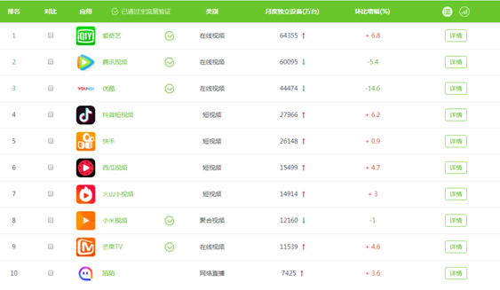 根据艾瑞8月份的视频服务数据,在代表用户规模的月独立设备数上,分属BAT旗下的爱奇艺、腾讯视频、优酷视频三巨头月活分别高达6.43亿、6.01亿、4.45亿,其中搜狐视频的月活用户仅为3964万,巨大的用户差距也让搜狐视频的app排名远远掉出前面的队伍。