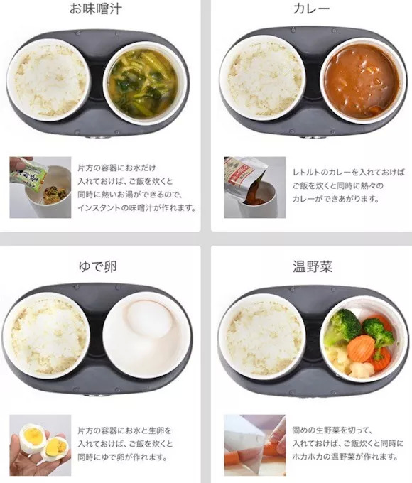 电饭煲的外形就是一个饭盒,重约1kg左右,放包里携带非常方便。煮饭的操作和普通电饭煲是一样的,倒入米和水再连上电源就可以。而且,两边还可以放下配菜和炖汤,嗯,为什么会觉得这样吃饭饭会有点心酸的感觉呢?